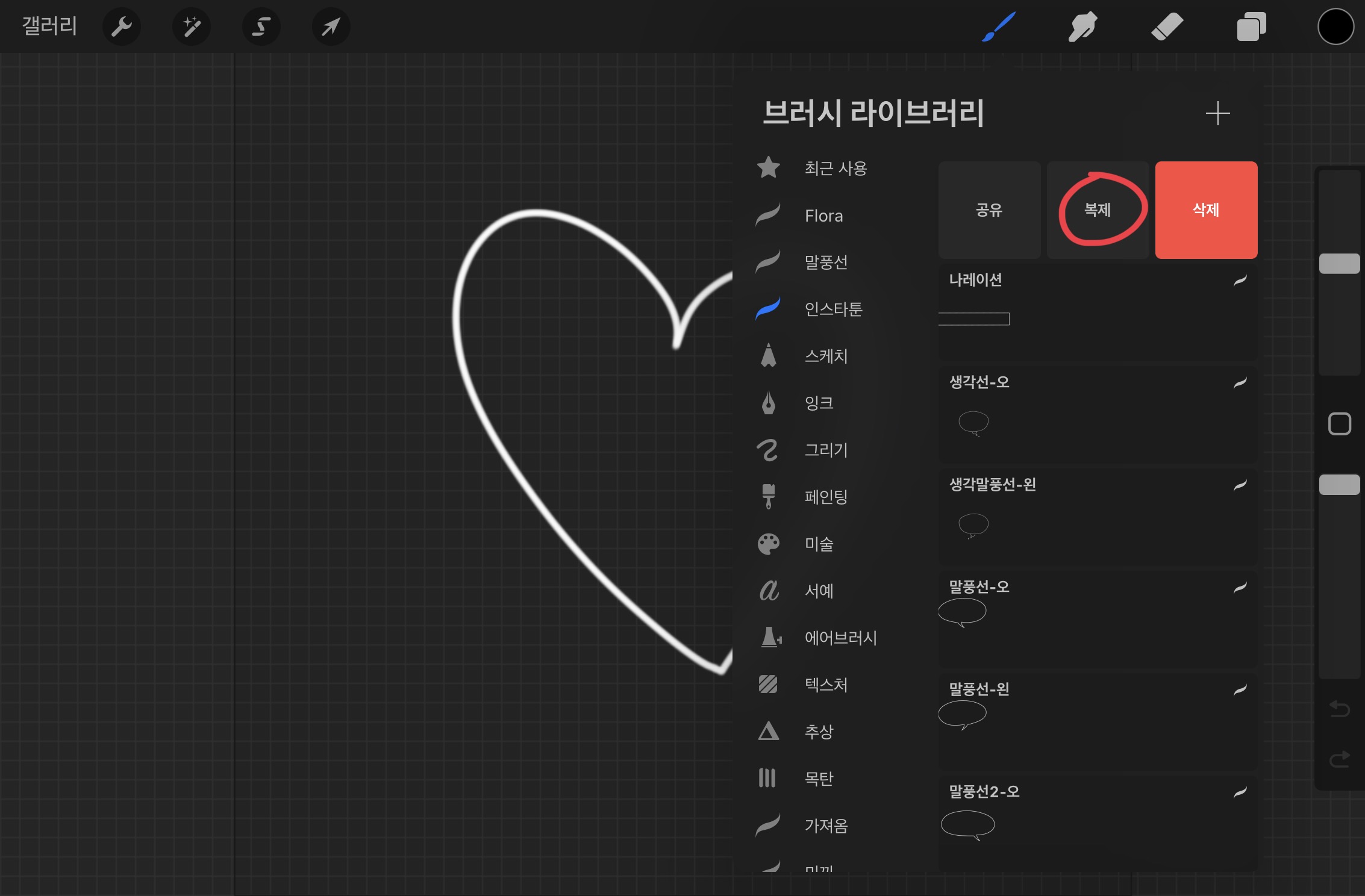 5. 이제 본격적으로 브러시를 만들어보겠습니다. 인스타툰 브러시 세트에서 한 브러시를 복제합니다. 브러시 복제하는 방법은 브러시를 오른쪽으로 넘겨서 복제를 선택합니다.
