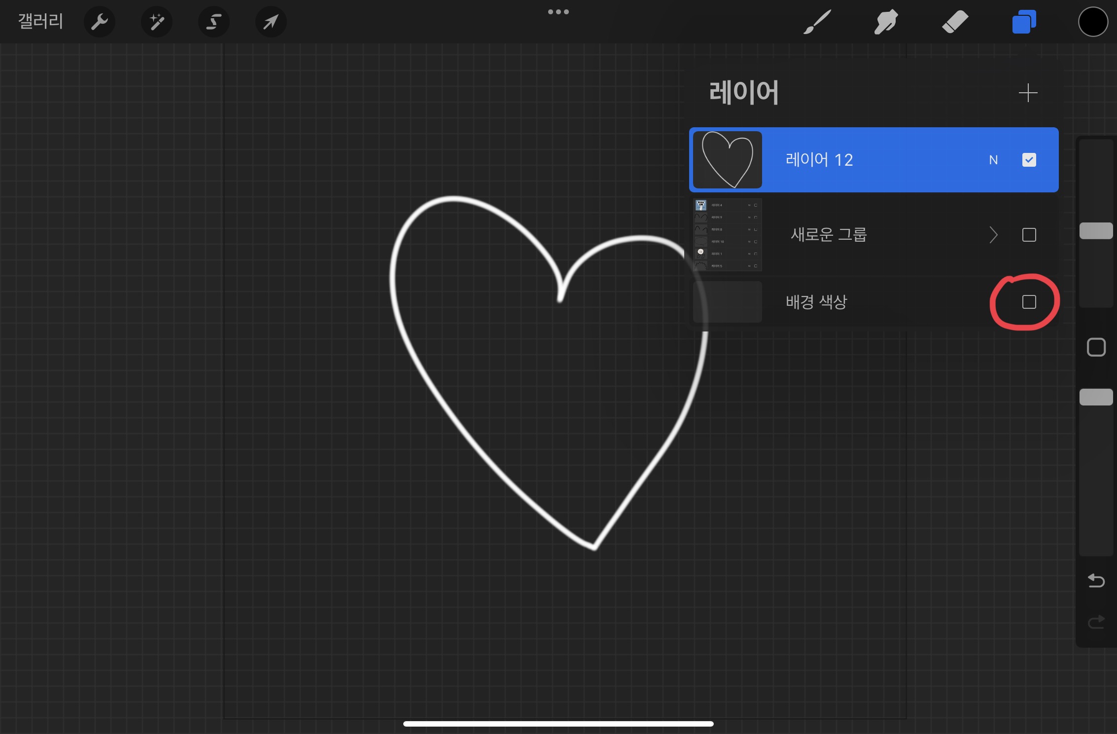 3. 배경색상 레이어를 꺼줘서 배경을 투명한 png 파일로 만듭니다. 레이어 끄는 방법은 레이어 오른쪽 네모 체크칸을 누르면 됩니다.