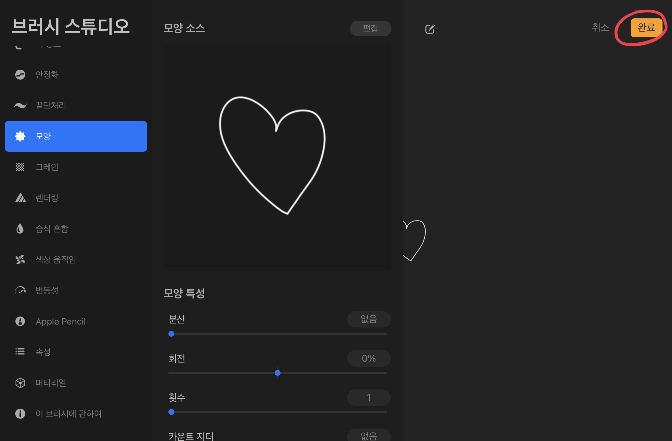 9. 브러시의 모양이 도장용 그림으로 바뀐것을 확인할 수 있습니다. 완료를 눌러줍니다.
